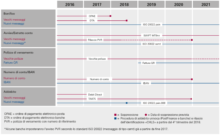 Durante il processo di armonizzazione / standardizzazione, la Svizzera si differenzierà per due tipi di messaggi diversi: "Payments Initiation (PAIN)" per i processi di trasferimento e "Cash Management (CAMT)" per gli avvisi e i report.